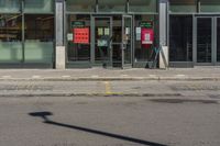 This photograph captures the modern urban design of a street in Toronto, Ontario, Canada. The city landscape features a glass shop front with multiple parking spaces. The road surface is made of asphalt and the curb is clearly visible. The building facade casts a hard shadow on the sidewalk. This image represents the bustling city life and contemporary architecture of Toronto. It showcases the entryway to a tunnel and a parking lot, highlighting the urban infrastructure and design in Canada's largest city.