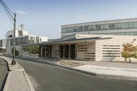 A city bus pulls up to the side of a street in Toronto, Canada. Modern architecture and mixed-use properties dominate the cityscape. Clear sky illuminates the bustling business district at the break of day.
