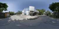 Modern architecture in Toronto's business district. A fish-eye view captures the sleek lines of a building next to trees and a fenced-in area. Clear sky highlights the glass and metal walls.