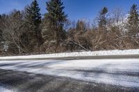 A winter landscape in Ontario, Canada. Snow-covered trees and branches contrast against the clear sky. The road surface, asphalt tinted with tar, winds through the evergreen forest. Nature at its wintry best.