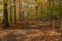 A lush autumn landscape in Ontario, Canada. The forest is ablaze with vibrant colors as the trees transition to their fall foliage. A gravel path leads through the natural environment, inviting recreation and exploration.