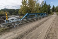 a metal bridge crosses over a dirt road near trees and a river in a remote region