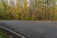 A winding asphalt road in Ontario, Canada. It curves through a dense forest, with deciduous trees lining the path. The road surface is tar, creating a smooth thoroughfare. Shadows from the trees create beautiful patterns on the grassy land lot. A serene landscape in Toronto.