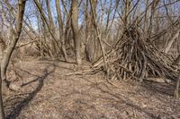 an open shelter of twigs made by two people with a fire hydrant in the middle of it