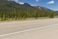 A scenic landscape in the highlands of Canada. The road stretches through lush forests and alongside a river, with majestic mountains in the background. Clear skies and fluffy cumulus clouds add to the natural beauty.