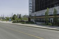 This is an image of an empty street in a residential area of Toronto, Canada. The road is made of asphalt and is lined with houses, buildings, and street lights. Cars are parked on the side of the road. The clear sky above contrasts with the urban landscape. In the distance, there are skyscrapers, factories, and warehouses, representing the industrial nature of the city. This photo showcases the urban design and infrastructure of Toronto on a typical day.