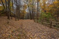 This image captures a beautiful landscape in Ontario, Canada. The scene features a dirt road cutting through an open grassy area surrounded by trees and forest. The deciduous trees have vibrant yellow leaves, creating a stunning display of nature. The road surface is made of gravel, adding to the rustic feel of the scene. A fence runs alongside the road, demarcating the boundaries of the area. The clear sky overhead provides a beautiful backdrop to the landscape. This photo represents the tranquility and natural beauty found in the outskirts of Toronto, Ontario.