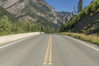 A scenic mountain road in British Columbia, Canada. The straight path leads into a forested landscape with clear skies overhead. Armco barriers protect against the slope and highland terrain.