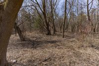 This is an image of a beautiful autumn landscape in Ontario, Canada. The photo shows a forest with deciduous trees displaying tints and shades of brown. The grass surface is covered with fallen leaves and undergrowth. In the open space, there are gravel pathways and a clear sky above, providing a serene atmosphere. The trees' trunks and twigs can be seen, adding to the natural beauty of the scene. This photo captures the essence of nature and the changing seasons in Ontario.