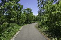 A straight road in Ontario, Canada, lined with lush green vegetation and trees. The clear sky overhead illuminates the tar road surface. Nature's beauty is showcased on this picturesque Canadian landscape.