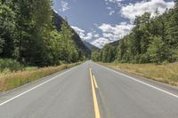 A road in British Columbia, Canada, cutting through a picturesque landscape of mountains and forests. The asphalt road surface leads the way down the slope, surrounded by lush grass and trees.