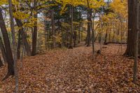 This is a beautiful landscape image in Ontario, Canada. The photo captures an open space with a clear sky above. The foreground features a mixture of grass, dirt, and gravel, with scattered trees and twigs adding to the natural scenery. The forest in the background provides a lush backdrop, with its trees and leaves showcasing shades of yellow and brown. Toronto's skyline can be seen in the distance, a reminder of the city's proximity to this serene natural setting. This photo is a perfect representation of the beauty of nature in Ontario, Canada.