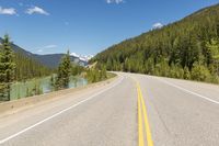 This is a scenic image of a straight road in Canada, specifically in British Columbia or Alberta. The road surface is asphalt, leading through a landscape of mountains and forests. On either side of the road, there are tall pine trees. In the background, there is a clear sky with fluffy clouds. A body of water can be seen behind the road, adding to the beauty of the scene. This photo captures the natural beauty and serenity of the Canadian wilderness.
