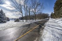 This is a scenic landscape image taken in Ontario, Canada. The photo captures a road that cuts through a beautiful forest on a sunny day. The sunlight filters through the branches of the trees, casting shadows on the asphalt road surface. The clear blue sky with fluffy clouds adds to the natural beauty of the scene. This picture represents the harmony between nature and man-made infrastructure in Ontario. It showcases the stunning road surrounded by lush vegetation and highlights the sunny weather. A perfect depiction of the serene landscapes found in Ontario, Canada.