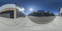 A modern office building in Toronto, Canada, captured in a fisheye view. The building's sleek design and glass facade reflect the clear sky. The surrounding urban landscape and parking lot add to the metropolitan feel of the scene.