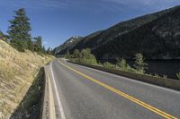 A breathtaking view of an elevated mountain road in British Columbia, Canada. The road winds through stunning landscapes, surrounded by high mountains, lush vegetation, and clear skies. The Armco barriers provide safety along the highland slopes.
