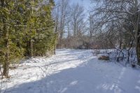 A snowy path in Ontario, Canada, leading to a small wooded area. Bare trees stand against the backdrop of a snowy ground. Clear skies and sunshine illuminate the wintry landscape.