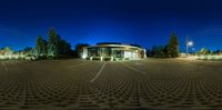 A modern parking lot in Toronto, Canada, illuminated by a circular light structure at night. The clear sky enhances the artificial light. The empty lot and contemporary architecture create a sleek and inviting atmosphere.