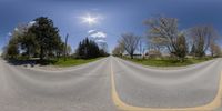 a fish eye lens view of a road that runs through the field and is partially filled with green grass and bushes