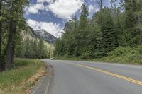 This scenic landscape photo showcases a winding asphalt road surrounded by lush forests and towering mountains. The image captures the natural beauty of Canada's highlands in British Columbia's Lillooet region. The road surface seamlessly blends with the surrounding vegetation, creating a harmonious connection between man-made infrastructure and nature. The clouds in the clear blue sky add depth and texture to the composition. The majestic trees and gentle slope of the land create a serene and picturesque scene. This photo perfectly depicts a tranquil day in the stunning Canadian landscape.
