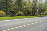A picturesque rural road in Ontario, lined with lush green trees and wooden fences. The yellow road surface contrasts with the vibrant green grass and hedge. A tranquil nature path in Canada.
