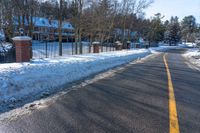a road in the winter next to houses and trees with snow on it's sides
