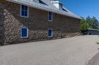a brick building sitting next to a parking lot under a clear blue sky of some sort