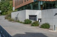 This is an image of a residential area in Toronto, Canada. The photo captures the urban design and architecture of the neighborhood, with high-rise buildings and residential properties. The road and asphalt surface are surrounded by grass, trees, and vegetation. The image shows the shadows of fences and trees, as well as the curb and road surface. The photo represents a suburban public space in Toronto, with the slope and hard shadows adding depth to the scene. In the background, there is a theater with an elevated fixture. This image showcases the urban landscape and design of Toronto.