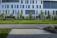 This is an image of a modern office building in Toronto, Canada. The building's facade features large windows and a sleek architectural design. The surrounding area is a busy business district with paved roads and sidewalks. The cityscape is filled with a mix of commercial and residential buildings, creating a vibrant urban landscape. The image also showcases the lush green grass, trees, and shrubs that provide a natural contrast to the concrete surfaces. The clear sky and clouds cast dramatic shadows on the ground. This photo captures the essence of urban design and real estate in Toronto.