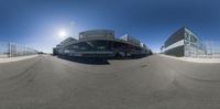 A modern architecture building in Toronto, Canada, surrounded by an open space parking lot and an empty street. The building features a glass facade, reflecting the clear sky. The urban design creates a symmetrical and sleek look.