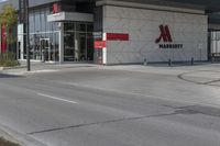 A modern cityscape in Toronto, Canada. The vibrant business district features office buildings, shops, and storefronts. Clear skies highlight the grey urban design with concrete and asphalt roads. Public spaces lined with signage add to the city life.