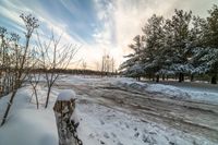 snowy dirt road lined with trees at sunset near the park with snow piled in the foreground