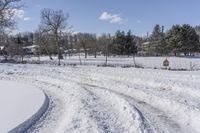 A snowy road cutting through a picturesque field in Ontario, Canada. The road winds its way past trees and bushes near a fence, leading into the wide open plain. The snow-covered landscape creates a serene and peaceful atmosphere on this winter day. The clear sky and distant horizon add to the sense of tranquility. This beautiful Canadian scenery captures the essence of nature in its purest form. The vegetation and winter scene make it a perfect representation of Ontario's natural beauty. This image showcases the stunning landscape and freezing temperatures that can be found in this region. Taken near Toronto, this road offers a straight view down its curve, inviting exploration and adventure.
