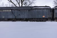 This image captures a gloomy winter day in Toronto, Canada. The grey sky hangs low over the snow-covered landscape. In the foreground, a train can be seen on a railroad track, with the industrial buildings and factories in the background. The surface is covered with a layer of snow, giving it a gloomy atmosphere. This photo represents the mode of transport and industrial infrastructure in Toronto during winter.