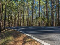 A road in the Canary Islands, Tenerife, winds through a dense forest of tall pine trees. The asphalt road surface contrasts with the towering trees, creating a scenic landscape with a low, hard shadow.