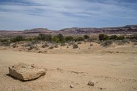 A stunning landscape in Moab, Utah featuring red rock formations and desert vegetation. Clouds dot the sky on a clear day. Off-road tracks lead to Dubinky Well Road, surrounded by the beauty of canyonlands.