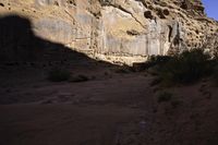 This image captures the scenic beauty of the desert landscape in Utah, USA. The photo showcases the red rock formations and canyons of Canyonlands with their unique tints and shades. A person is seen hiking up steps surrounded by cliffs, scrubs, and vegetation. The clear blue sky adds to the picturesque view. This photo showcases the natural beauty and rugged terrain of the North Wash region. It represents a perfect day for outdoor exploration and adventure in the stunning landscapes of Utah.
