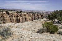 Rugged red rock cliff formations in Canyonlands, Moab, Utah. Clear skies highlight the elevated and open terrain. Green vegetation contrasts with the barren desert landscape. A perfect day for off-road adventures.