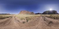 a panorama of two roads going through a desert field, one shows the path and the other has an amazing view
