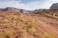 A rugged and scenic landscape in Utah, USA. The low-lying sand dunes and red rock formations create a stunning contrast against the blue sky. A dirt road winds through the canyonlands, surrounded by vegetation and grass. A perfect day for off-road adventures.
