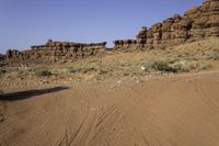 the red rock formations of a rocky area with the dirt covered ground on the opposite side and rock outcrops on the left