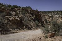 A rugged landscape of red rock formations in Canyonlands, Moab, Utah. The desert terrain features canyons and outcrops. Clear skies contrast with the sandy streets and off-road tracks of this scenic nature area.