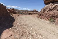 a dirt and gravel road winding through the mountains on a sunny day at arches in the background
