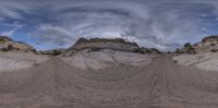 A gloomy day in the desert landscape of Utah, with grey skies and a rugged terrain. The red rock formations of San Rafael Swell create a stunning backdrop. The road winds through the canyonlands, surrounded by towering mountains.