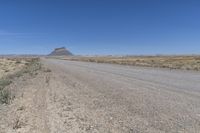 This is an image of a desert landscape in Utah, USA. The red rock formations and rugged terrain of the San Rafael Swell dominate the scene. A dirt road, known as the coal mine road, stretches across the plain, giving access to off-road tracks and canyons. The road surface is composed of soil, gravel, and asphalt. The clear sky and vast horizon add to the breathtaking beauty of the area. This photo captures the natural geology and ruggedness of the Utah desert, making it a perfect representation of the scenic and adventurous nature of the region.