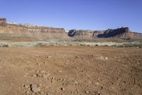 A breathtaking landscape of the Canyonlands in Utah, USA. Red rock formations and canyon walls create a stunning geological phenomenon. Clear skies and open spaces highlight the beauty of the desert terrain.