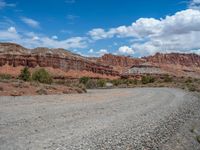 A scenic landscape in Capitol Reef, Utah, with an off-road dirt track winding through nature. Clear blue skies with fluffy clouds add drama to the rugged terrain. A perfect day for adventure.