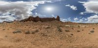 a desert view from a google earth viewing vr viewer lens, with some clouds in the blue sky and a distant orange rock formation in the distance