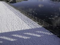 the snow covered surface on the ground by a river and bridge is empty without one person in sight