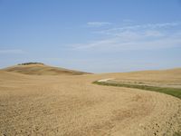 A car is driving on a dirt road in a field near wheat fields under a clear blue sky. The Tuscany countryside provides a breathtaking landscape with its rugged hills, vast plains, and beautiful open spaces. The natural environment is filled with green grass surfaces, giving a peaceful and rural feel. This picturesque prairie resembles a European steppe, perfect for enjoying the day and connecting with nature. The scene captures the essence of Tuscany's charm, offering a glimpse of the bountiful harvest and well-maintained gardens found in this idyllic Italian region.